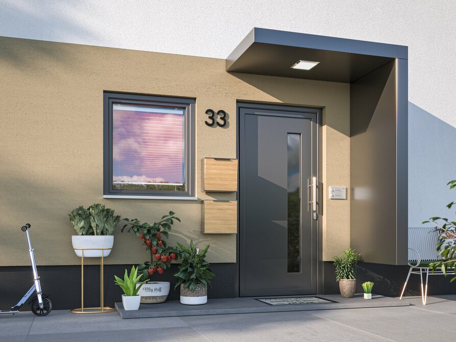Aluminium ist ein modernes Material für Vordächer. Es verfügt über eine Optik mit klaren Linien und einer eher kühlen Ausstrahlung und eine glatte Struktur. Es ist zudem sehr robust und pflegeleicht.
